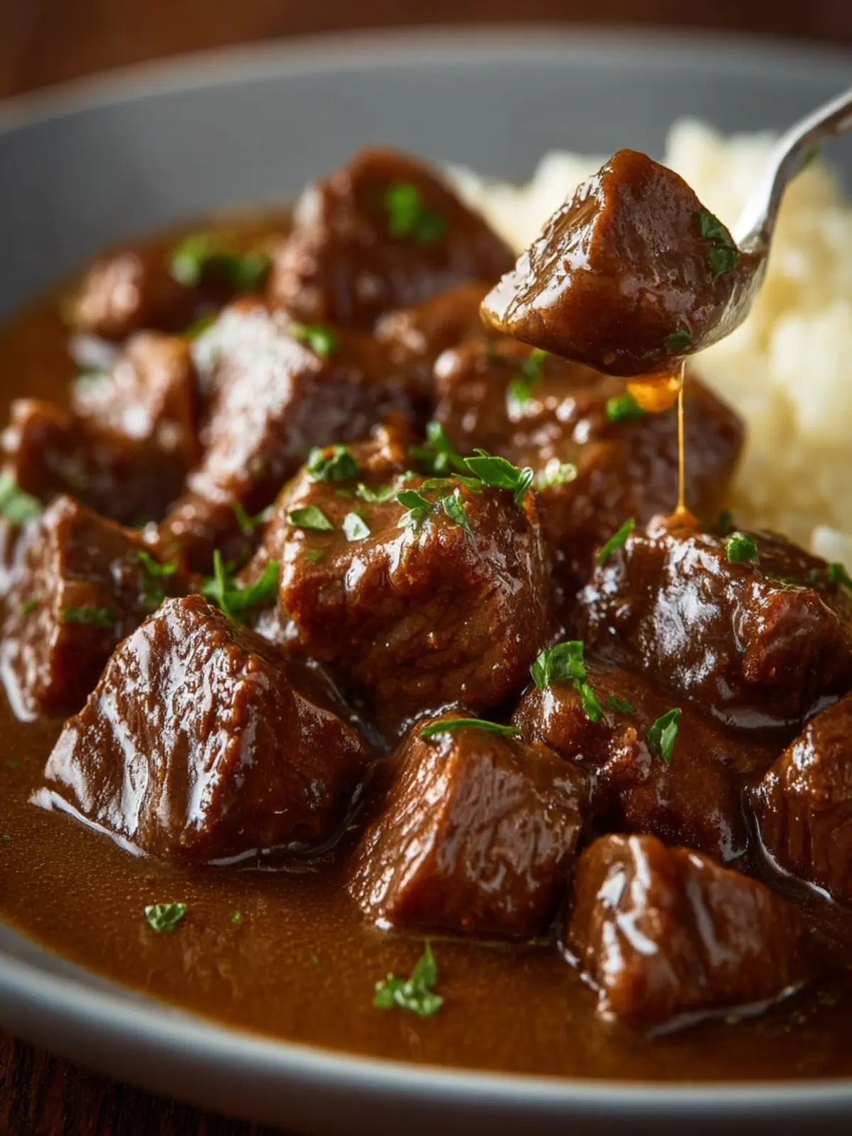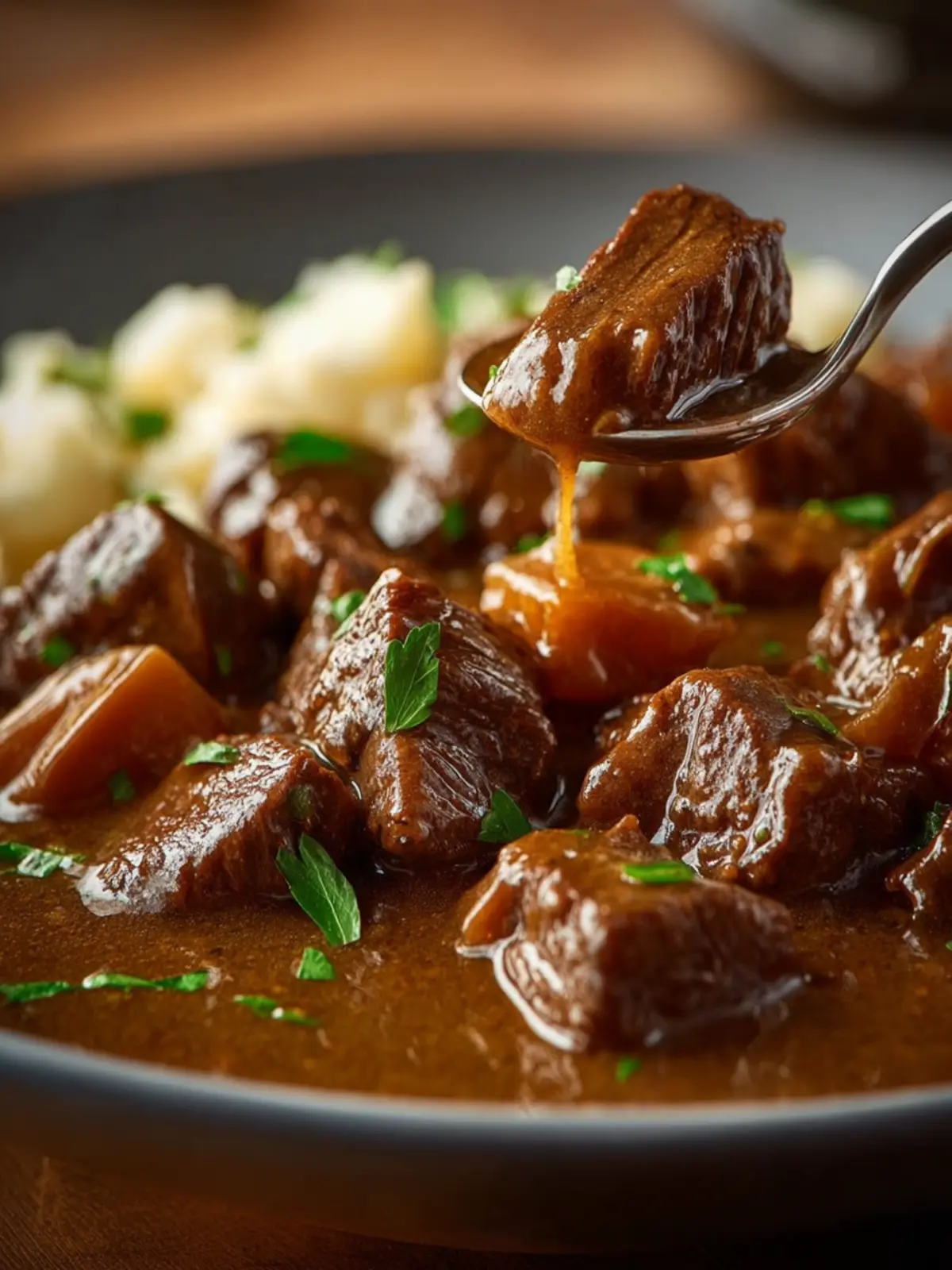 7. Serve hot over mashed potatoes, rice, or egg noodles. Garnish with fresh parsley if desired.