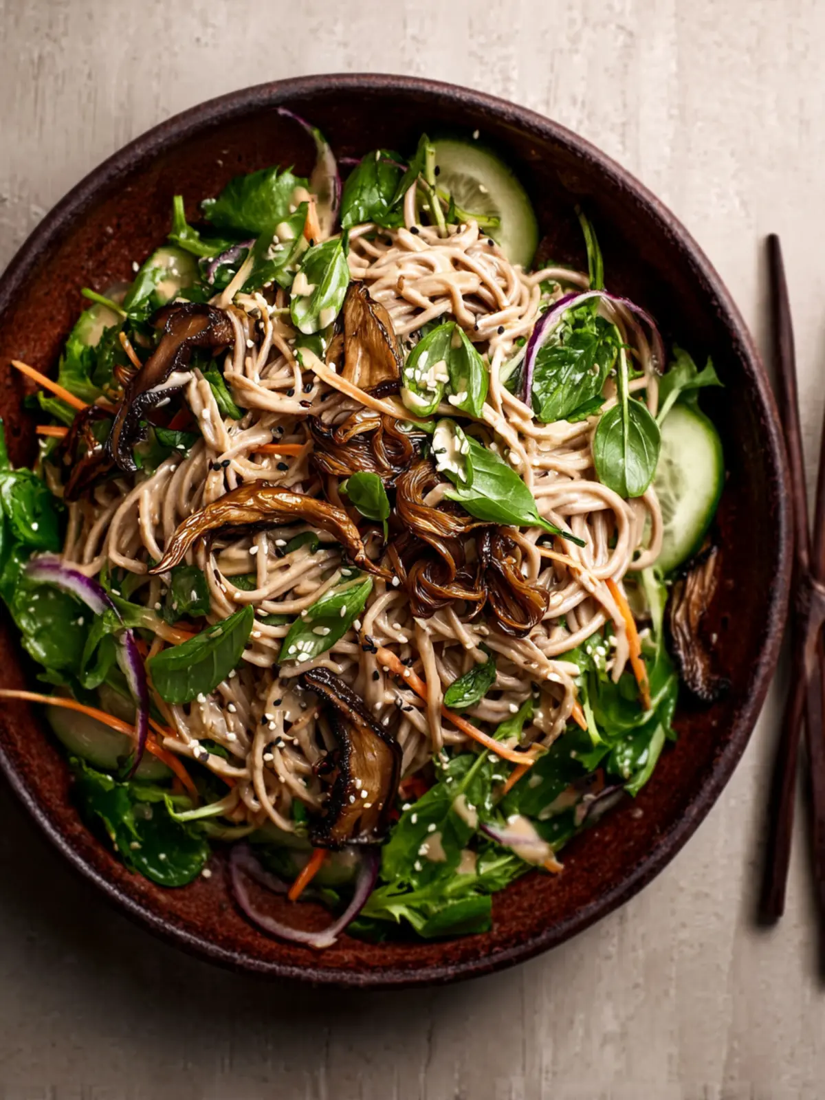A delicious and healthy soba noodle salad topped with crispy shiitake mushrooms, fresh vegetables, and a tangy tahini dressing.