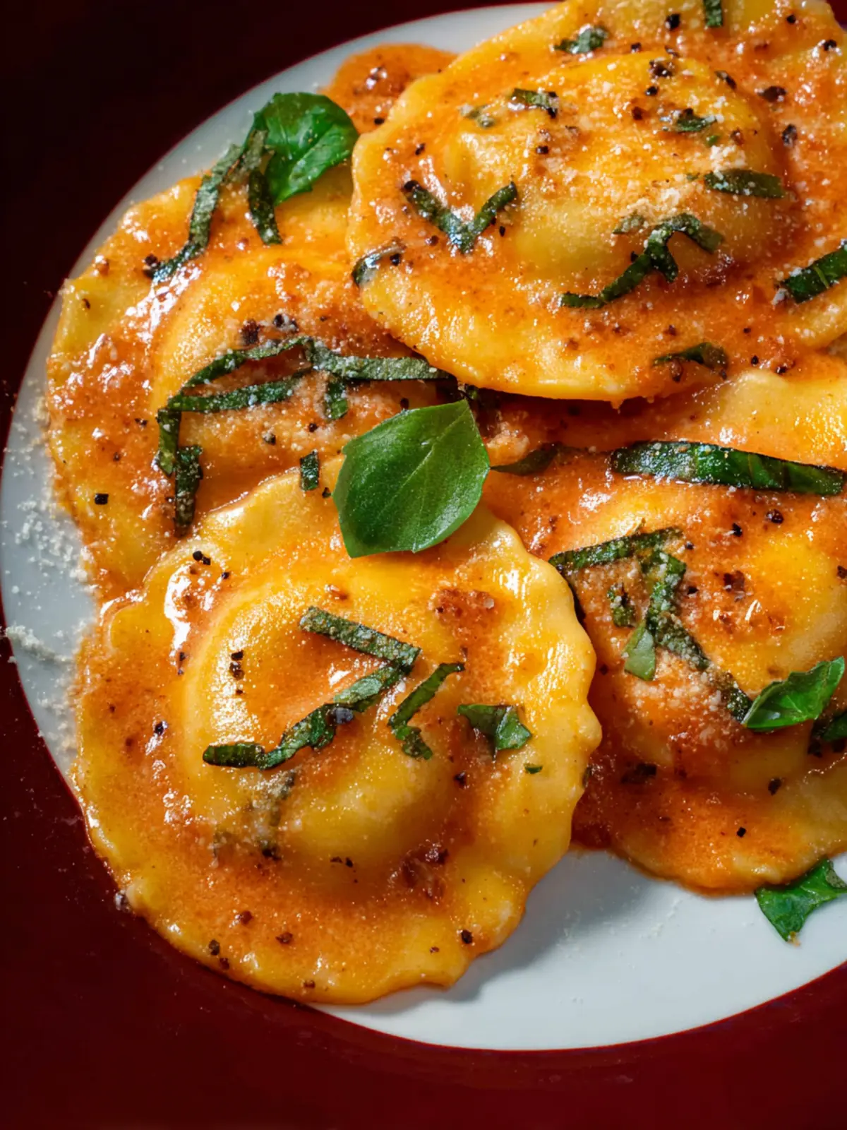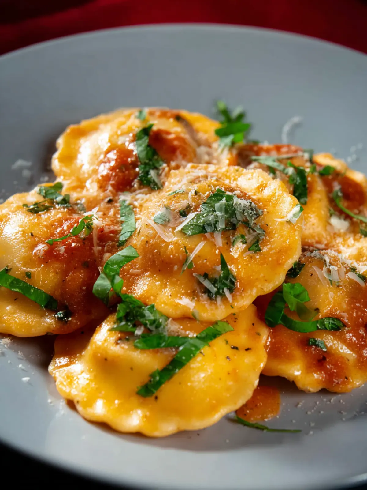 A delicious creamy ravioli dish with a rich tomato sauce, perfect for any occasion.