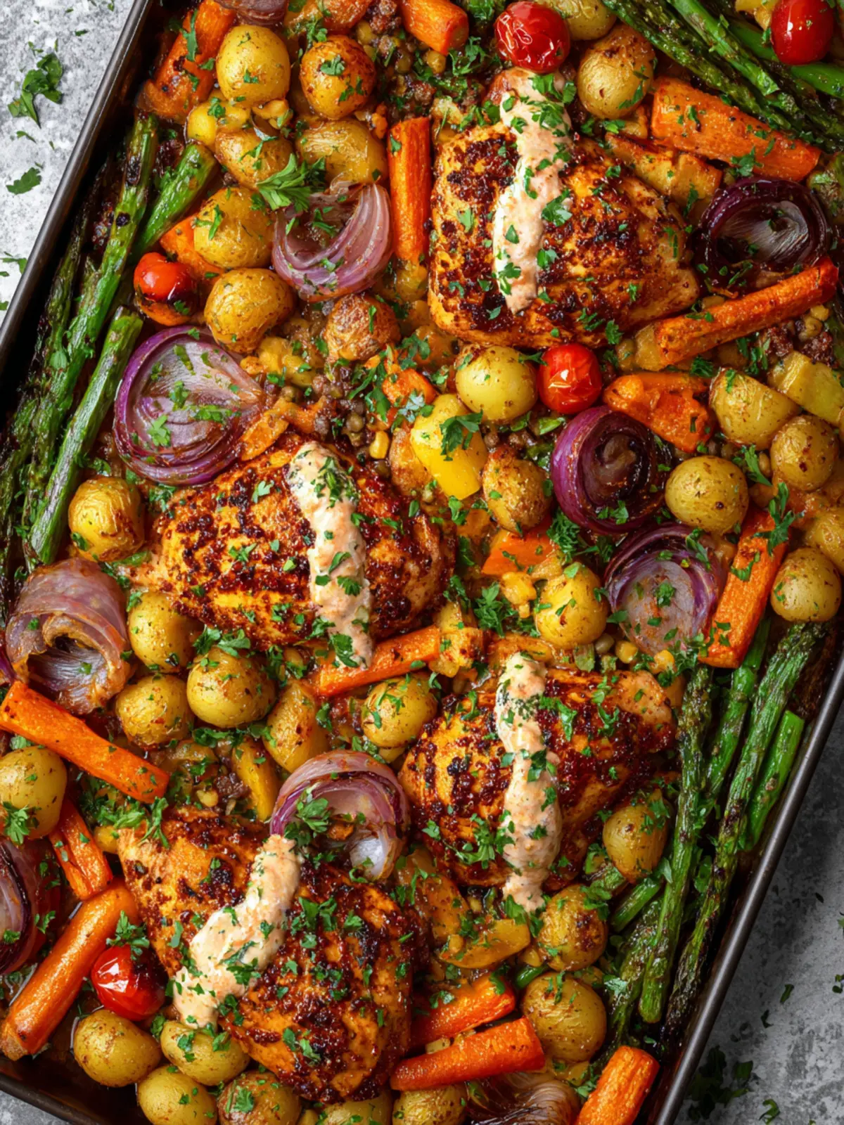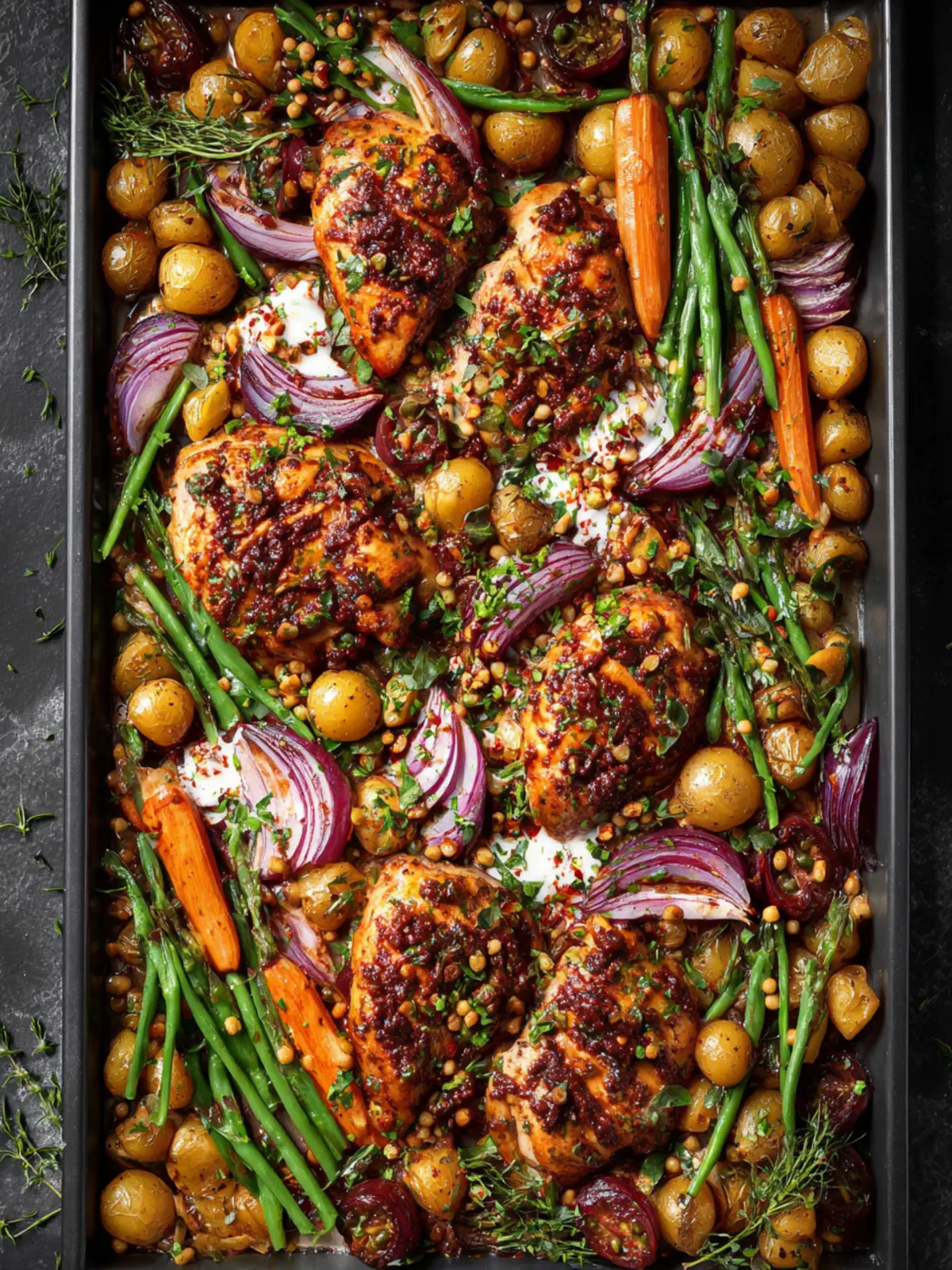 Arranging everything on one sheet pan not only simplifies cleanup but ensures everything cooks evenly. Keep the veggies slightly crowded for that perfect roast without drying out the chicken.