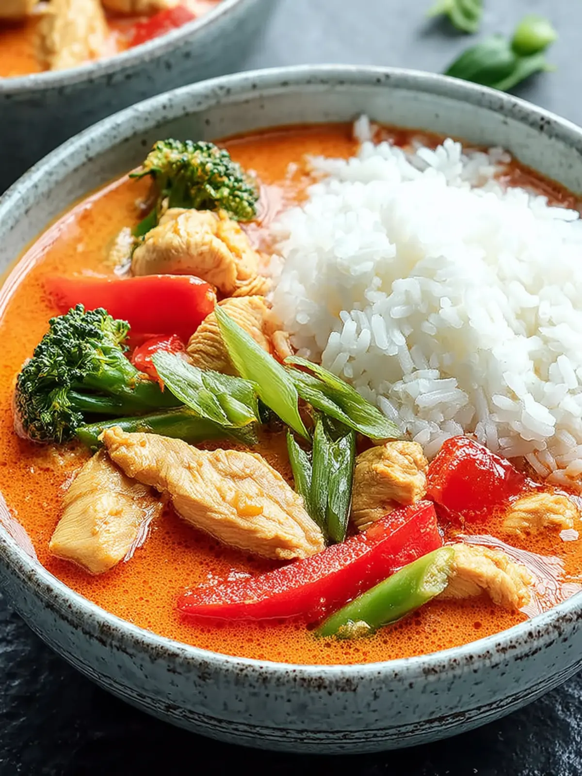 The beauty of this curry lies in its complex yet harmonious flavors. The coconut milk provides a silky, rich base while balancing the heat from the red curry paste. Fresh ingredients, like vibrant bell peppers and tender chicken, elevate the dish, allowing each bite to burst with freshness. It’s a celebration of flavors that feels both adventurous and comforting.