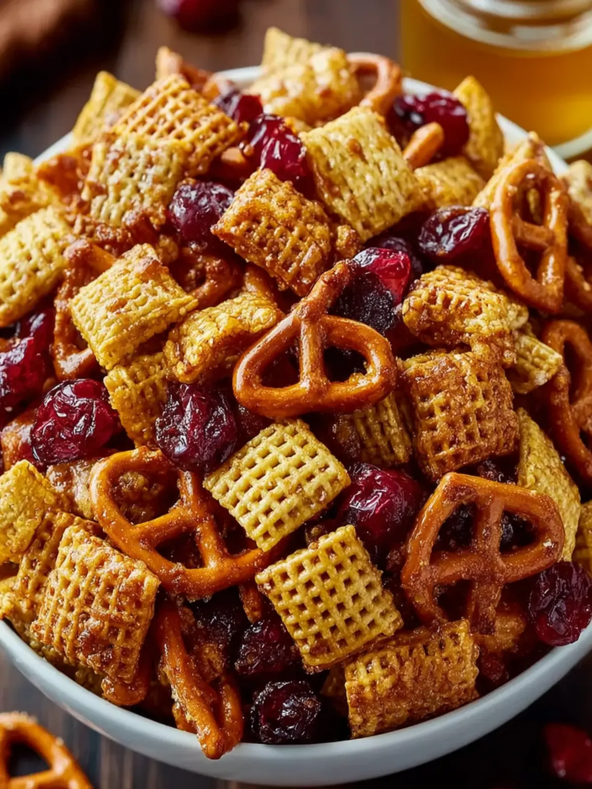 - In a large mixing bowl, combine 3 cups of Rice Chex, 3 cups of Wheat Chex, 2 cups of pretzel sticks, 1 cup of pecans, and 1 cup of dried cranberries. Stir gently to evenly distribute.