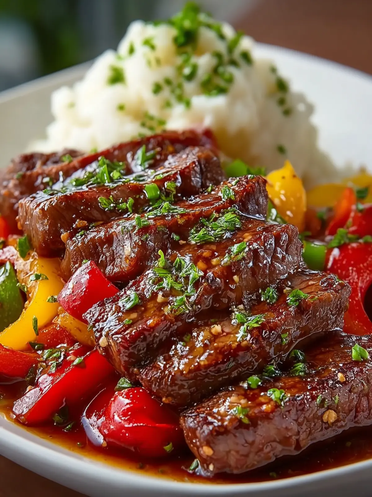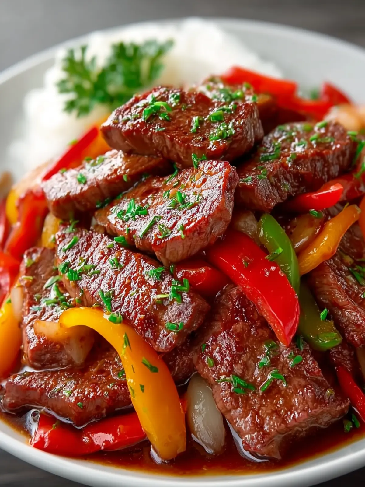 Colorful Vegetables: A medley of vibrant bell peppers—red, green, yellow—adds not just color but a sweet crunch that juxtaposes well with the savory beef. Fresh vegetables ensure every bite is not only tasty but visually appealing.