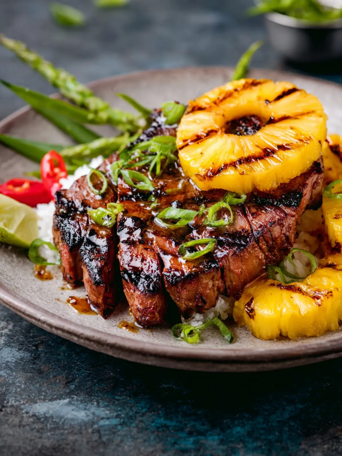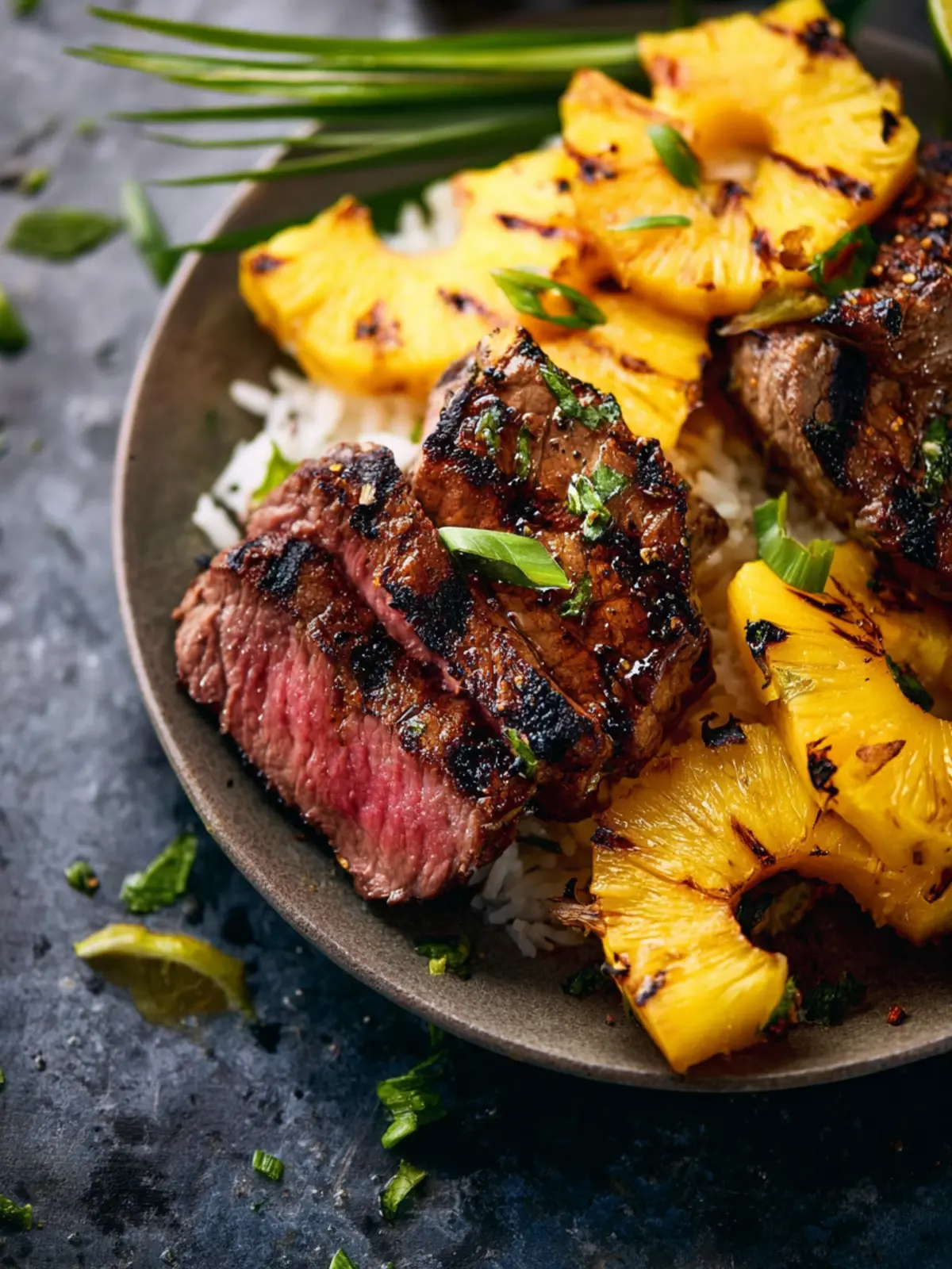 12. Divide rice among serving bowls. Top with sliced steak and pineapple. Garnish with reserved green onions and lime wedges. Drizzle lime juice over bowls and serve immediately.