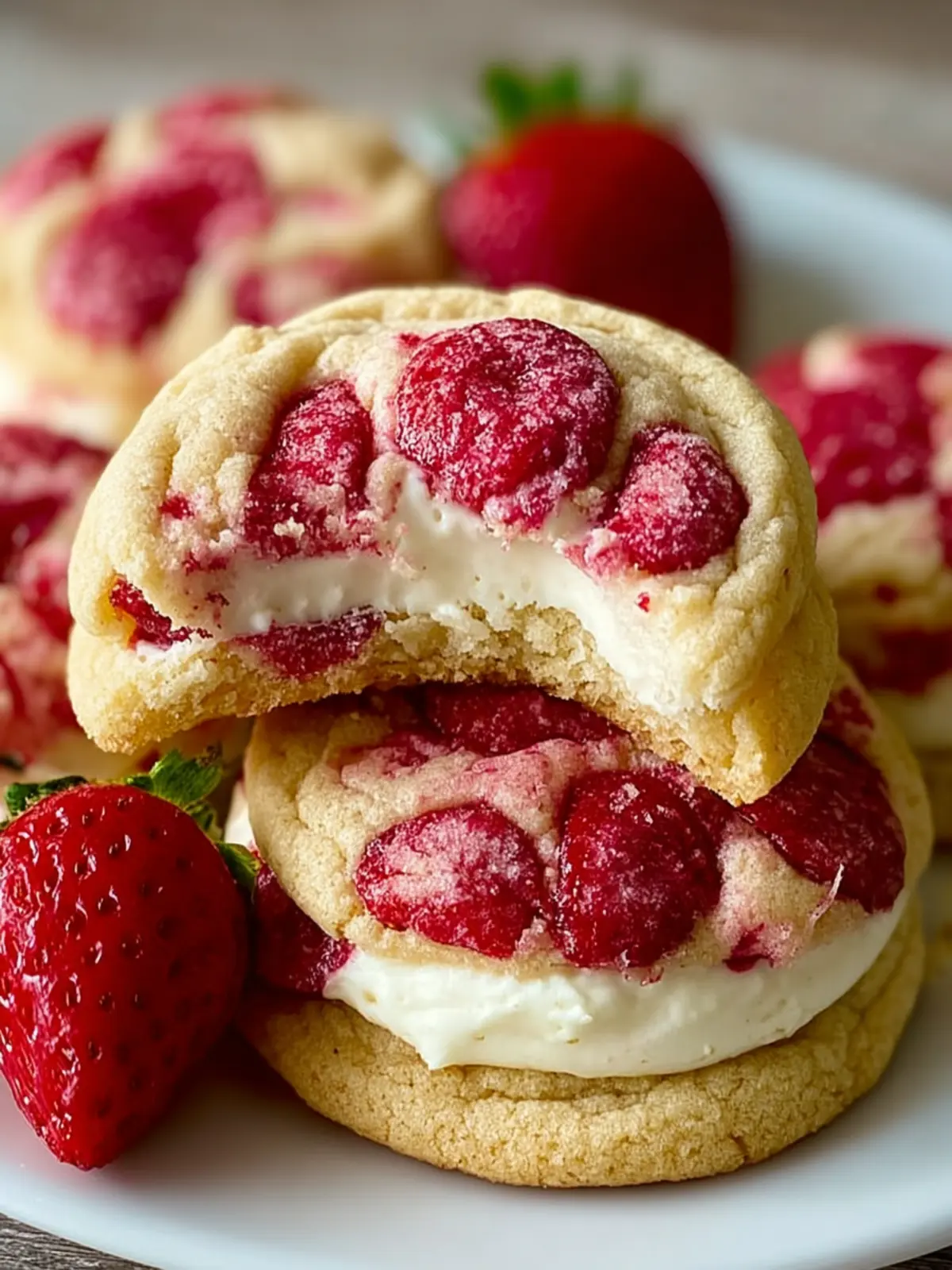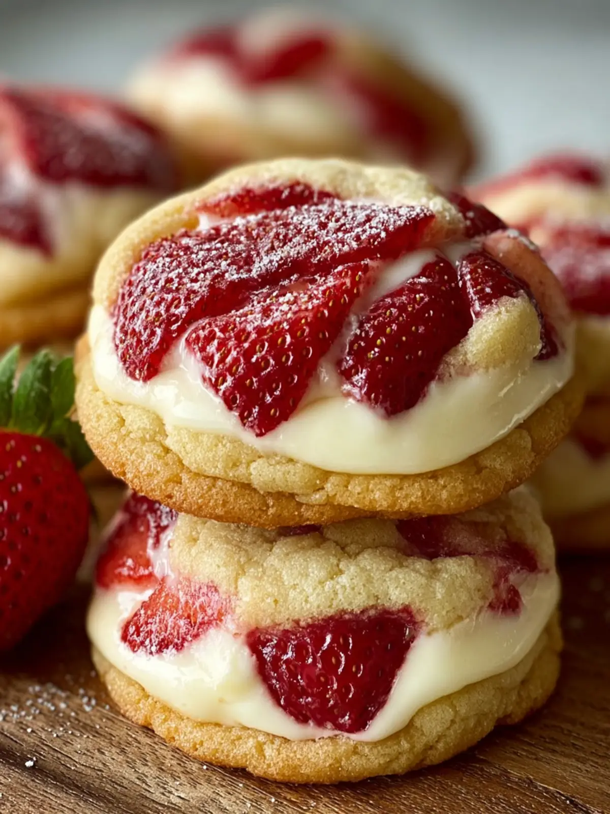 Delicious cookies filled with creamy cheesecake and fresh strawberries.