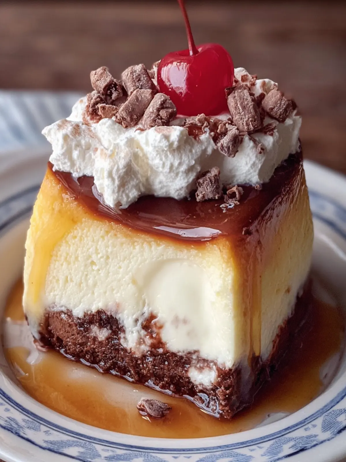 A delicious combination of chocolate cake and creamy flan, topped with whipped cream and cherries.